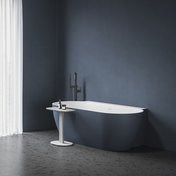 Mit seiner Form und Höhe bildet der Wood S Tisch die perfekte Ergänzung zu einer freistehenden Badewanne in verschiedenen Farbtönen. Er bietet eine praktische Ablagefläche und füllt gleichzeitig den Raum im Bad geschmackvoll aus.