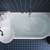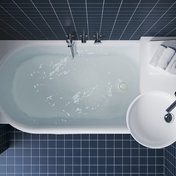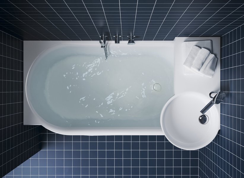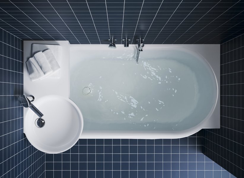 Die ergonomisch geformte Badewanne sorgt auch dort für Bequemlichkeit, wo nur wenig Platz vorhanden ist. Lehnen Sie sich entspannt zurück – mit einem Waschbecken über der Wanne genießen Sie Ihr Bad selbst in einer platzsparenden Lösung.