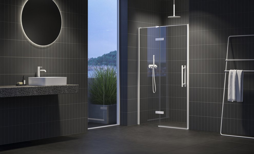 Zweiteilige Duschtür Cool! in glänzendem Chrom oder schwarz. Klarglasfüllung mit Schutzbeschichtung RAVAK Anticalc®. Öffnungssystem mit Scharnieren. Drehbares Produkt für eine linke oder rechte Variante. Die ideale Lösung, um in einer Nische von 100 bis 120 cm Breite einen Duschraum zu schaffen.
