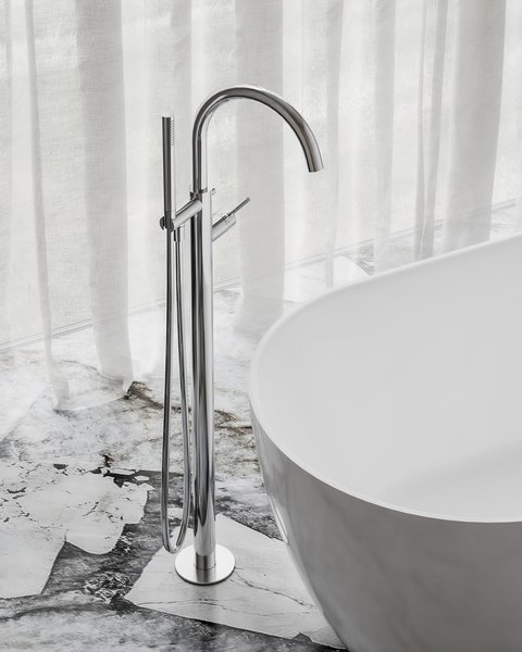 Die hohe und schlanke Armaturensilhouette schafft im Bad eine Sinfonie aus Schönheit und Nutzen. Aufgrund der Möglichkeit, dass die Badarmatur überall im Fußboden eingebaut werden kann, kann das Bad absolut frei sowie individuell gestaltet werden.