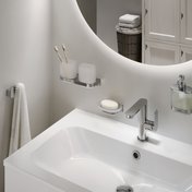 Der Halter mit Seifenspender im Design Chrome II mit praktischer Verwendung im Badezimmer zum schnellen Händewaschen. Das Produkt ist in den Farben Chrome und Schwarz matt erhältlich.