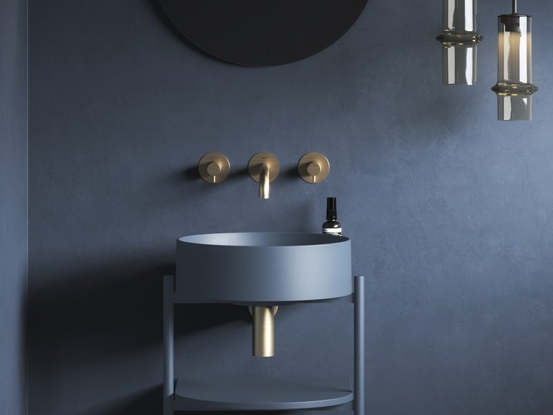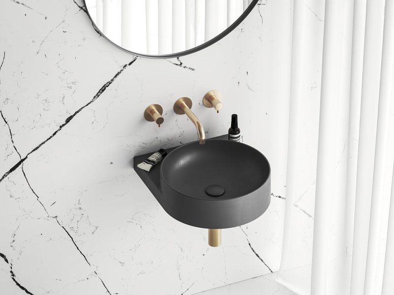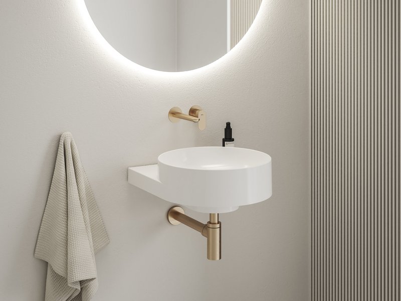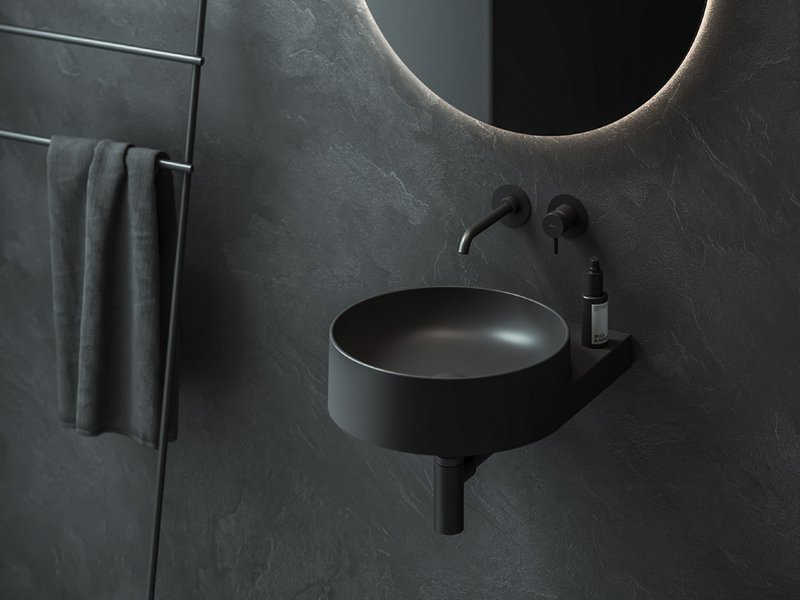 Das runde Waschbecken wird durch ein Designelement in Form einer Befestigungskonsole in Weiß, Schwarz oder Edelstahl ergänzt. Das Zusammenspiel von Konsole, Armatur, Siphon und Ablaufgarnitur sorgt für zauberhafte Eleganz.