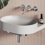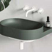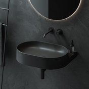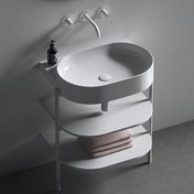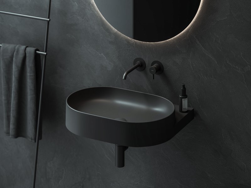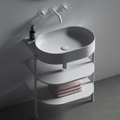 Das ovale Waschbecken wird durch ein Designelement in Form einer Befestigungskonsole in Weiß, Schwarz oder Edelstahl ergänzt. Das Zusammenspiel von Konsole, Armatur, Siphon und Ablaufgarnitur sorgt für zauberhafte Eleganz.